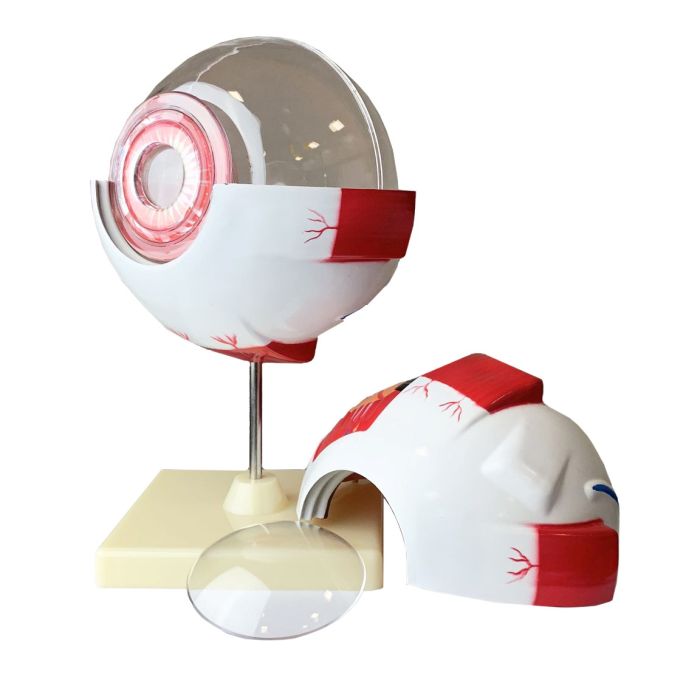 Ein detailliertes Modell des kompletten menschlichen Auges, das aus 6 verschiedenen Komponenten besteht. Das Modell ist achtmal so groß wie das normale Auge, wodurch alle Komponenten deutlich angezeigt werden können.