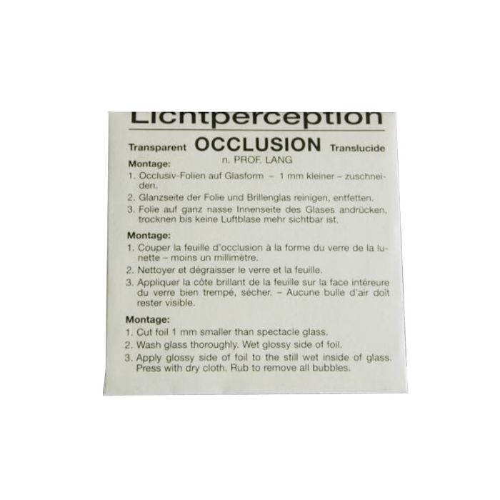 Diese Okklusionsfolie nach Bangerter ist farblos mattiert und behält die Haftung auf allen Beschichtungen. Einfach mit einer Schere in Form zu schneiden. Durch die Folie sind nur Helligkeit und Dunkelheit zu unterscheiden.