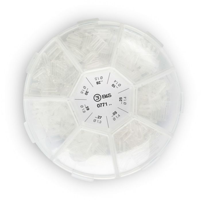 Sortiment aus 7 verschiedenen Kunststoffhülsen für Bohrbrillen, insgesamt 350 Stück.