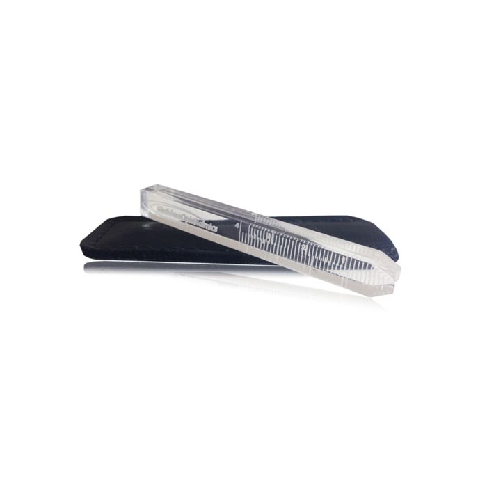 Exophthalmometer aus klarem Kunststoff mit Skala (mm) auf beiden Seiten.