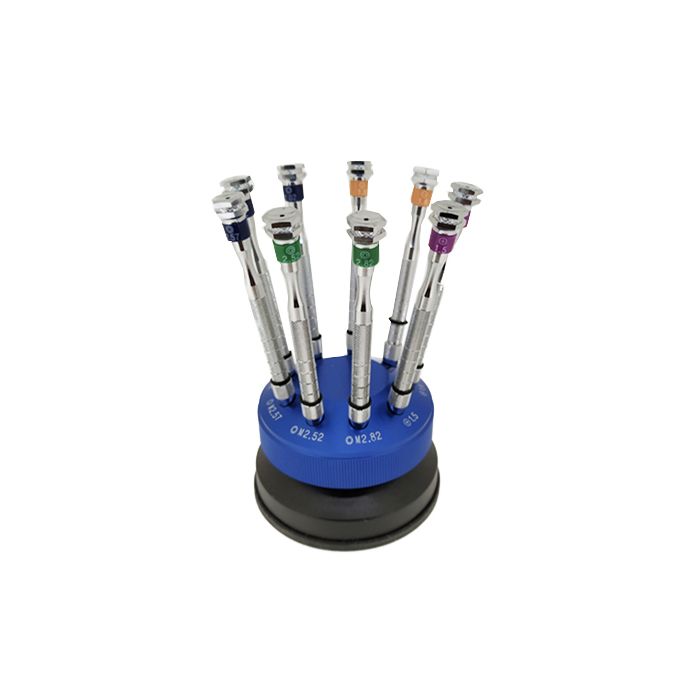 Praktisches 9-teiliges Schrauben- und Mutternset in drehbarem Aluminiumständer.