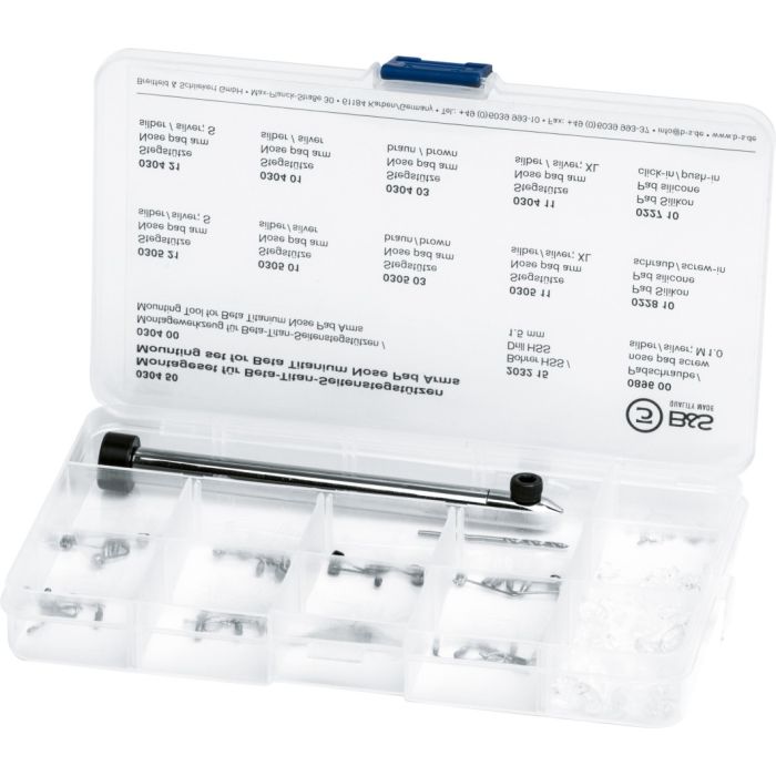 Inhalt: Werkzeuge für Nasenpads, 8 verschiedene Nasenpads, passende Bohrer und neue Pads sowie Padschrauben
