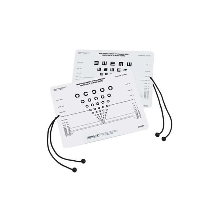 Kombination der E-Haken und Landolt C Nahkarte mit proportional gesperrten Zeilen. Die Karte ist beidseitig bedruckt mit den E-Haken auf der einen Seite und den C-Ringen auf der anderen Seite.